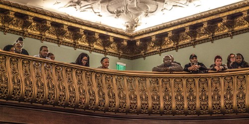 8_L371_ACS_hearings-2 Members and supporters look on from the balcony during the hearing at City Hall.
