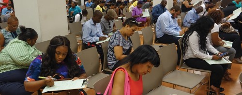 05_Hiring_hall Hopeful applicants attend the union’s first ever hiring hall for School Crossing Guards on July 25 that was organized by DC 37 and the New York Police Dept. The event took place at union headquarters.