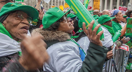 Lee Saunders, president of the American Federation of State, County and Municipal Employees (AFSCME), DC 37’s national union, said, “This is the time and this is the place where we take a stand today,” Saunders said. “We stand for power in numbers. We stand for unions!”