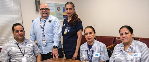 05_L420 UNION WINS BACK PAY. From left: Shop Steward José Muñoz, Institutional Aide Cesar Vasquez, Chapter Chair Robin Laracuente, Housekeeping Aide Betty Cabrera and Institutional Aide Carmen Torres of NYC Hospitals Employees Local 420.