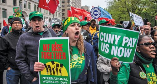 WE RISE TOGETHER: The cloudy and misting skies on a cool spring day did not deter the union never quit spirit, as DC 37 members and leaders participated in a May Day rally at Columbus Circle.