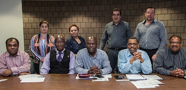 Seated from left are: Sayed Rahim and Sokunbi Olufemi, Local 1182; Andre Green, Derek Jackson and Donald Arnold of Teamsters Local 237. Standing from left are: Marlena Giga, Local 983; Alice Moise, Organization of Staff Analysts; Local 983 President Joe Puleo and Gordon Warnock also of Local 983.