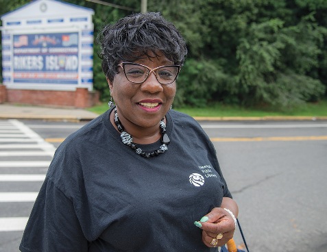 Stamp builds relationships with Corrections staff . She said, “They know me and what I do. I explain that when these men are reading they are not talking, arguing or fighting. That’s a good day on Rikers.”