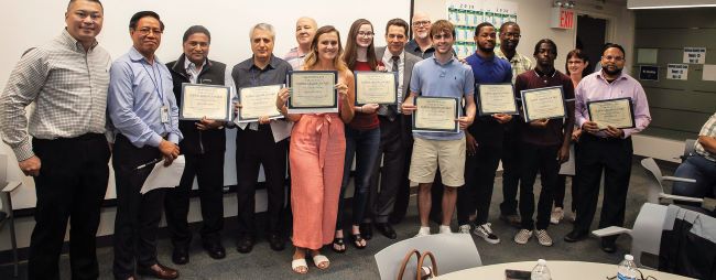 At its membership meeting on June 20, Local 1740 NYC School Construction Authority Technical Professional Employees awarded nine high school seniors entering college this fall scholarships totaling $9,200. From right is Richard Quinto and Nicaso Arugay of the local’s scholarship committee; Srinivas Kanaparthi, father of winner Uma Kanaparthi; Abd Zarrabi, father of winner Donna Zarrabi; Bernie Cossean and daughter Allyssa Cossean; Brena Stones; local President Charles Komlo; Jeff Stones, father of scholarship winner Breana Stones; Hayden Taylor; Torii Smith and her father Alton and scholarship winner Tyler Smith; Deirdra Taylor, mother of Hayden Taylor; and Mohibul Islam, father of ;Ramiya Islam. Not pictured: winner Tala Alawamleh.