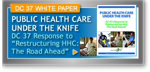 In Public Health Care Under the Knife – DC 37 Response to “Restructuring HHC: The Road Ahead” DC 37 also critiqued a 2010 report on the NYC Health and Hospitals Corporation and made proposals to stop contracting-out of public health services to keep vital HHC workers on the job.