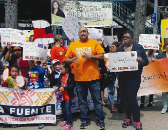 DC 37 Executive Director Henry Garrido joined Queens Library workers and community activists at rally earlier this year to demand a major increase in funding for the city's three public library systems. The campaign paid off: The New York City Council added $43 million to the library budget that will help reverse years of downsizing and service cuts. Photo by Molly Charboneau.