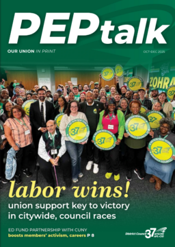 PEPtalk Magazine is our union in print– a spotlight on the members, services, and benefits that make DC 37 run. PEPtalk is mailed to active DC 37 members and members of the DC 37 Retirees Association every quarter. If you prefer to read PEPtalk digitally, sign up to receive the e-edition via email.
