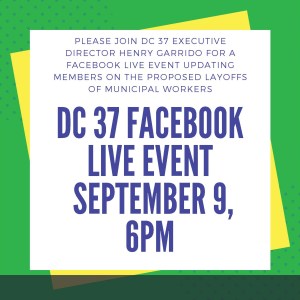 Join DC 37 Executive Director Director Henry Garrido on Facebook LIVE Wednesday, Sept. 9 at 6PM as he gives up-to-the-minute information on the Mayor’s proposed layoffs of 22,000 city workers, and what DC 37 is doing to press the state Legislature and City Hall to save jobs. A Q&A session with members will follow. Click here to join the discussion: https://bit.ly/355pwNk