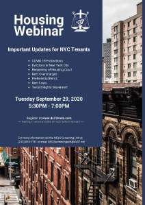 DC 37’s Municipal Employees Legal Services invites you to participate in a ZOOM webinar on Renters’ Housing Rights on Tuesday, September 29, 5:30 to 7 p.m. Join us for an update on tenant rights, the eviction moratorium, the re-opening of NYC Housing Court, COVID-19 defenses to non-payment, rent overcharges, preferential rents and the movement to strengthen tenant protection laws in New York State.