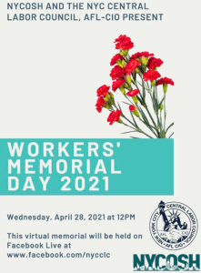 DC 37 members and retirees are invited to join NYCOSH, the New York City Central Labor Council, AFL-CIO, and other labor partners to commemorate the workers who have lost their lives on the job, including those workers who have passed as a result of exposure to COVID-19. The event will be live streamed at 12 noon on Wednesday, April 28, on Facebook Live. Please register here:https://bit.ly/3gL2GAN