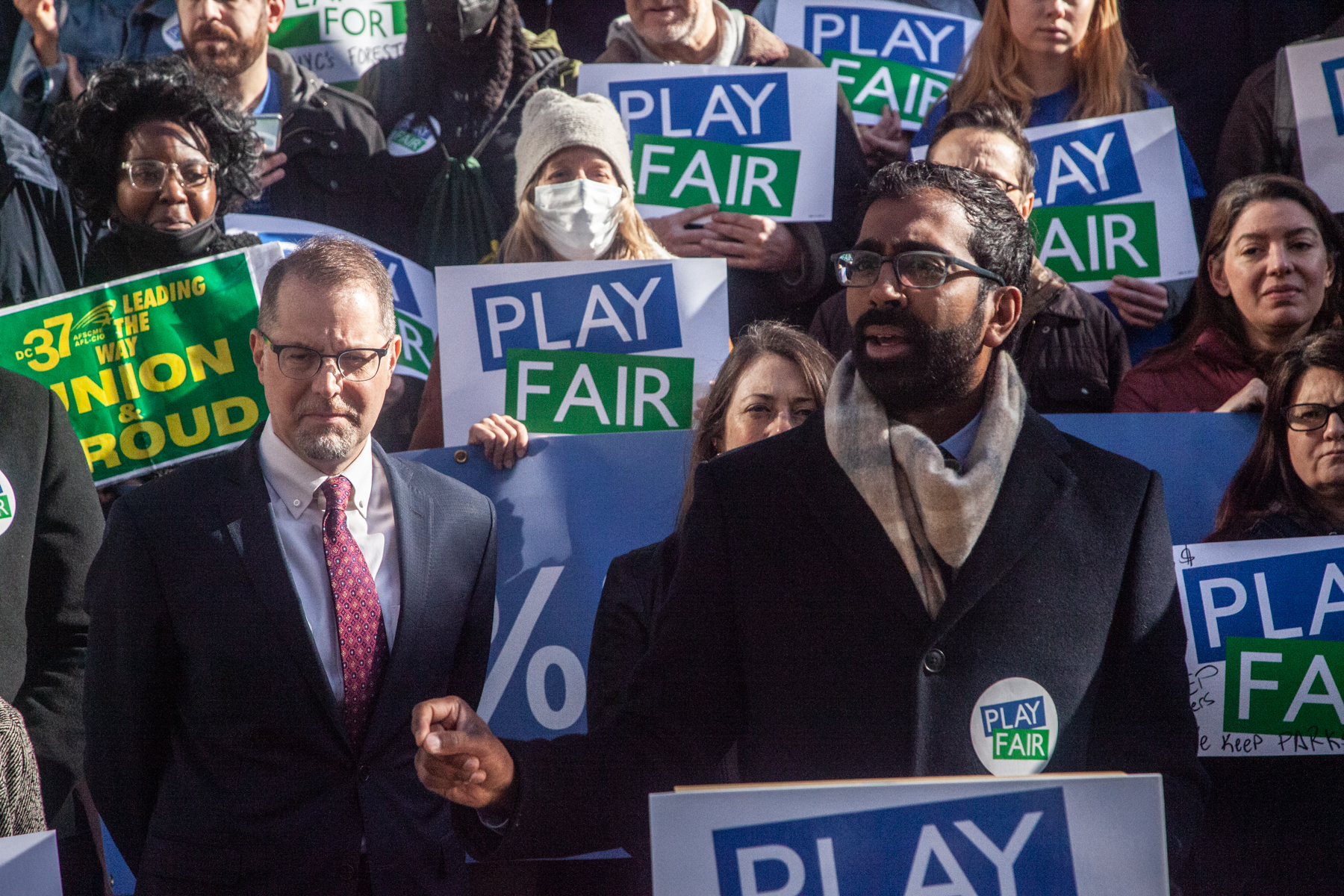 Hundreds of DC 37 Parks workers joined City Council Parks Chair Shekar Krishnan and Parks advocacy groups at the Play Fair Coalition rally at City Hall on March 22. The union is leading the fight for the Parks Department to receive 1% of the city budget, for hundreds of Parks jobs to be baselined, and to stop a proposed $60 million cut to the Parks budget.