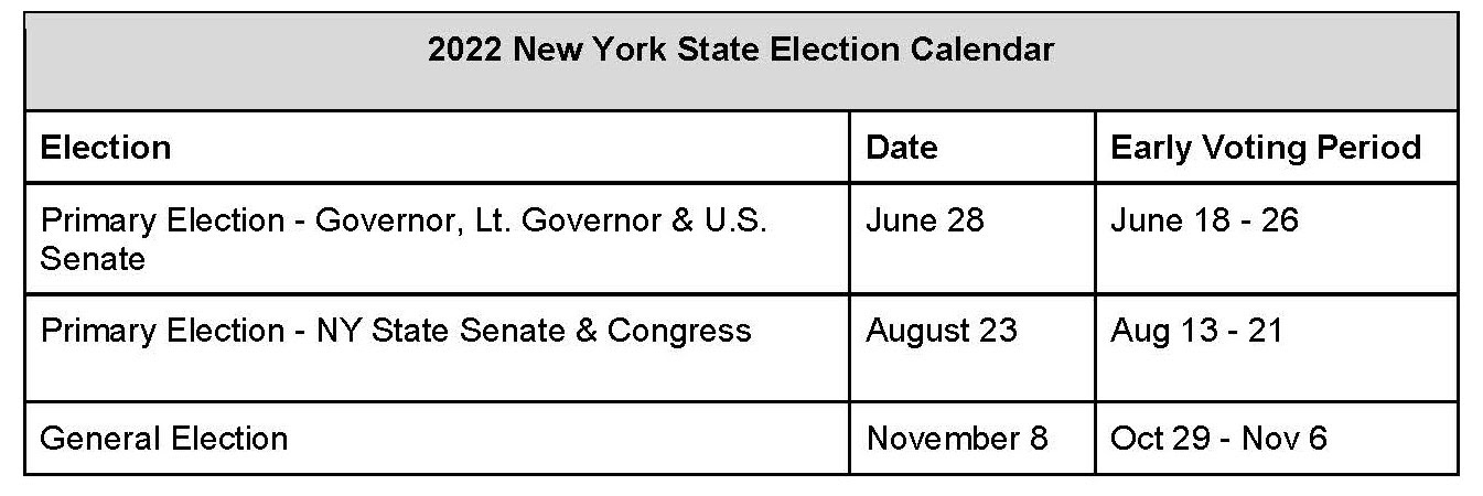 There are important changes to the 2022 election calendar that you and your family should know about. As a result of challenges to the initial redistricting process, New York State will have two primary elections in 2022. Primary elections for the Governor, Lieutenant Governor, U.S. Senate and New York State Assembly will take place on Tuesday, June 28. Primary elections for New York State Senate and U.S. House of Representatives will take place on Tuesday, August 23. The general election will take place on Tuesday, November 8, as originally scheduled.