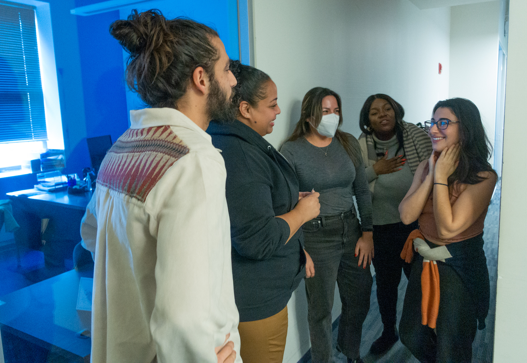 The vote count of the mail-in ballots, held remotely on Feb. 1, was a lengthy process overseen by the National Labor Relations Board. Resilience Lab Organizing Committee members and DC 37 Organizing Department staff watched the virtual count in anticipation, frequently checking laptops for information and worker lists posted on the wall while communicating with union attorneys on ballot challenges and rules.