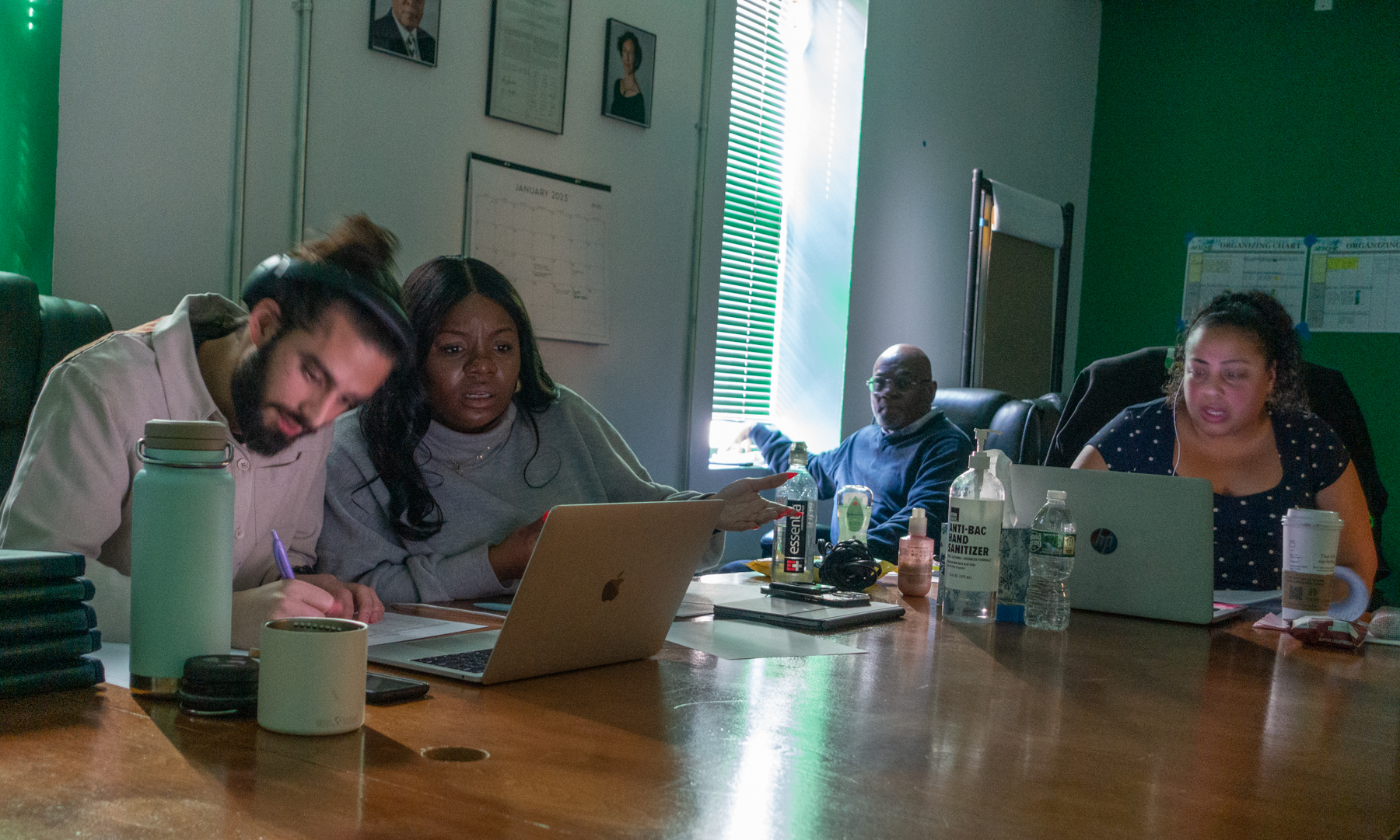The vote count of the mail-in ballots, held remotely on Feb. 1, was a lengthy process overseen by the National Labor Relations Board. Resilience Lab Organizing Committee members and DC 37 Organizing Department staff watched the virtual count in anticipation, frequently checking laptops for information and worker lists posted on the wall while communicating with union attorneys on ballot challenges and rules.