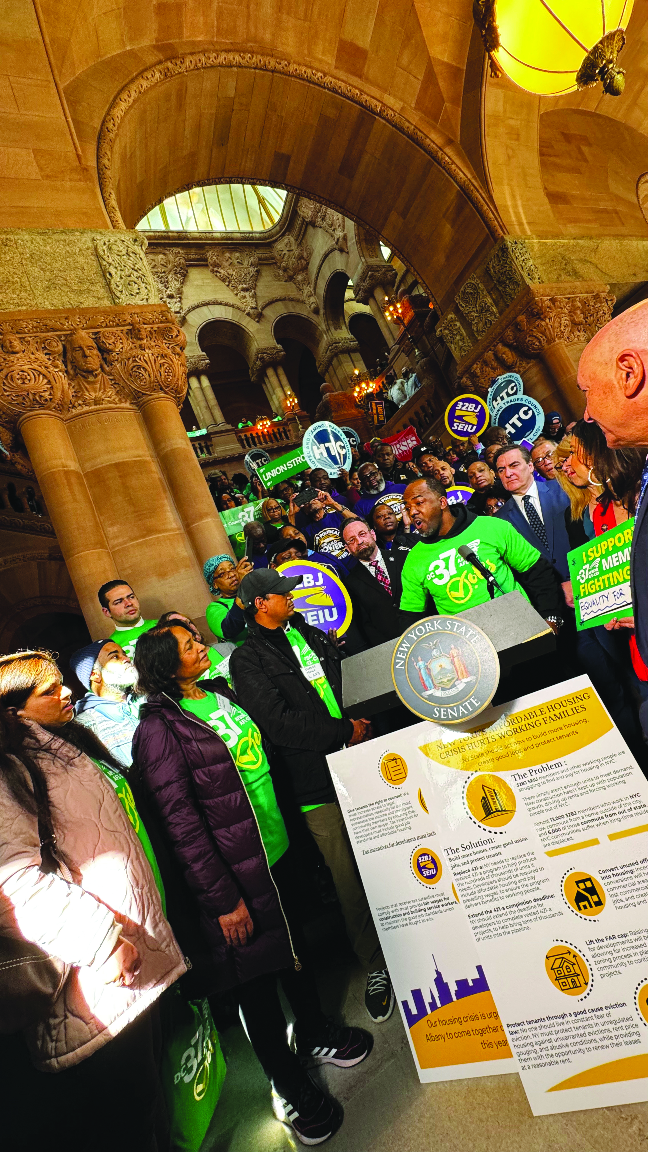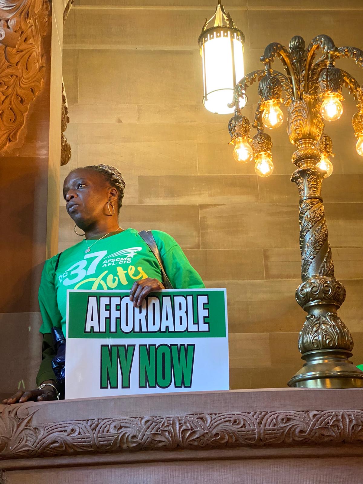 DC 37 activists also joined 32BJ SEIU and the Hotel Trades Council at a rally in support of affordable housing on the fabled “Million Dollar Staircase” in the lobby of the State Capitol. The unions collaborated on supporting a bill to build more affordable housing units and strengthen tenant protections against eviction.