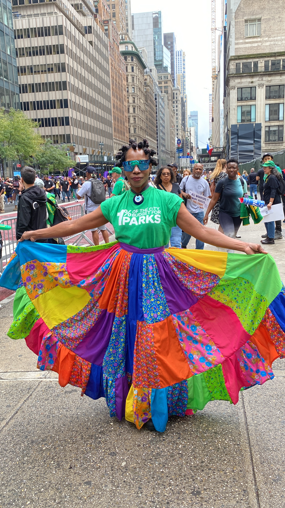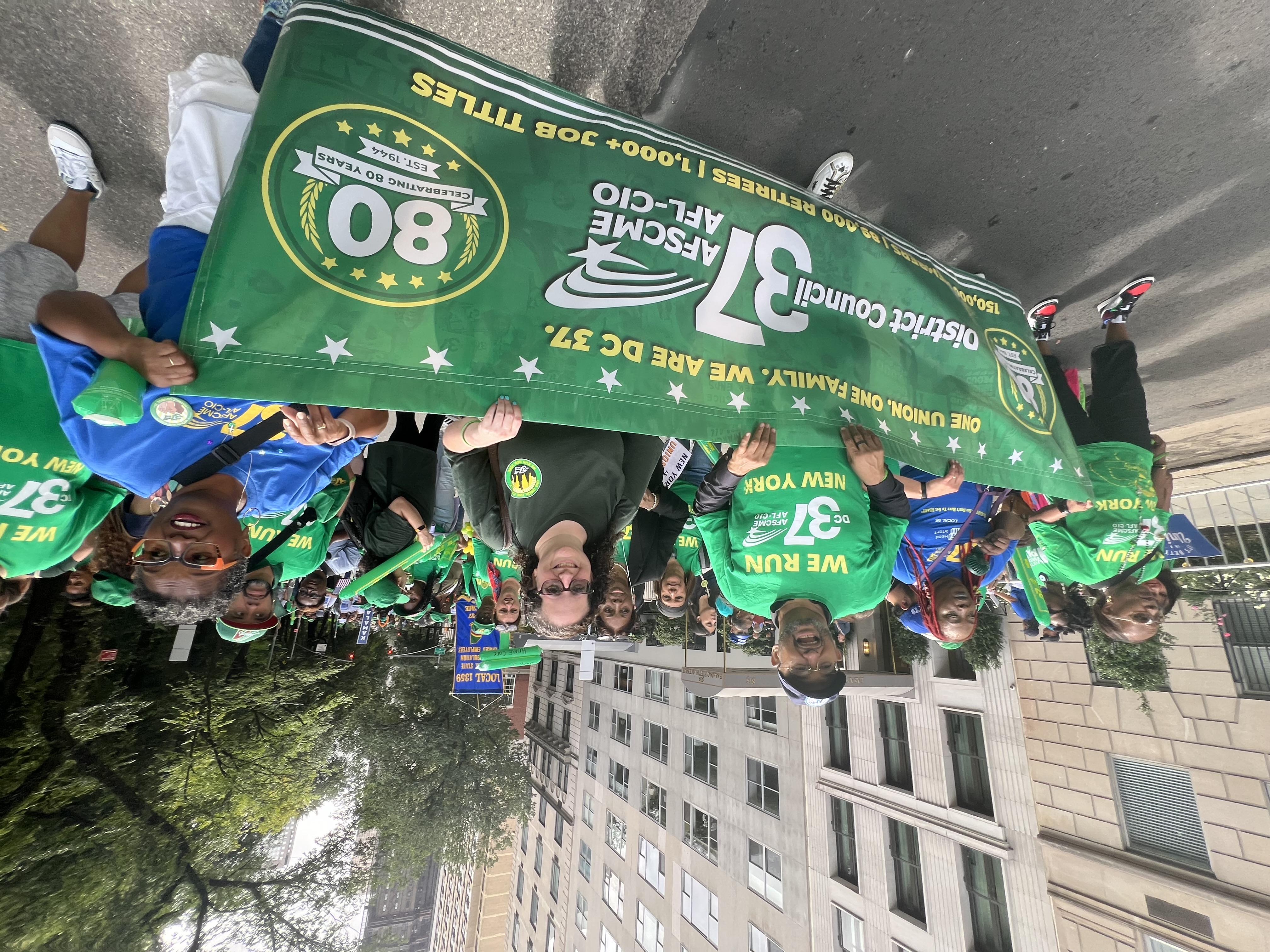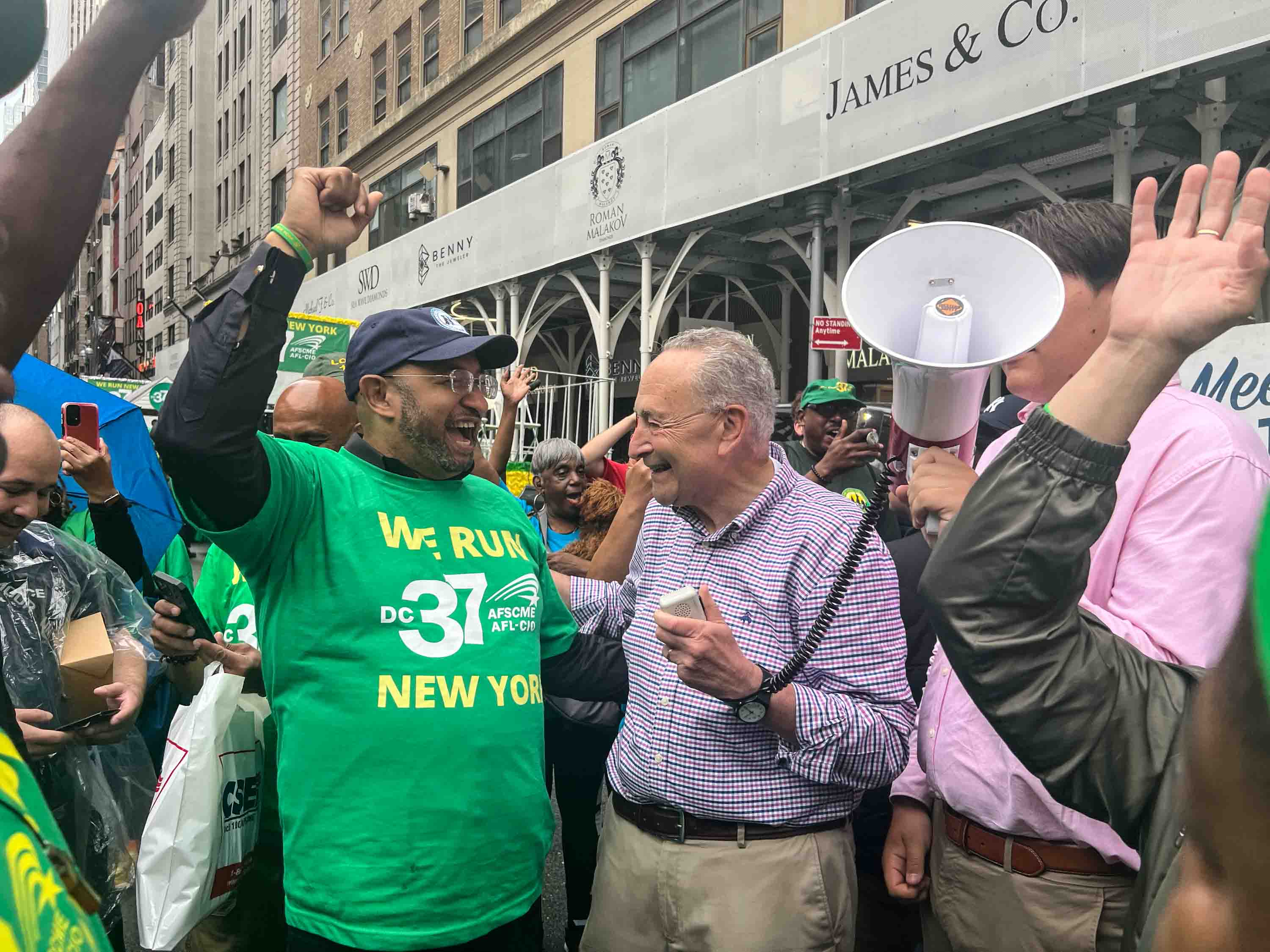 Despite intermittent drizzle, hundreds of DC 37 members, families, and allies gathered at the assembly location before stepping off to mingle, dance, and mark the upcoming occasion of the union’s 80th anniversary. Many elected officials, including U.S. Senate Majority Leader Chuck Schumer and New York State Comptroller Thomas DiNapoli, stopped by to greet members decked out in DC 37 green.