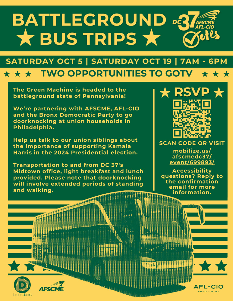 Help us talk to our union siblings in Philadelphia about the importance of supporting Kamala Harris in the 2024 Presidential Election. Transportation to and from DC 37’s Midtown office, light breakfast and hot lunch provided. Please note that this action will involve extended periods of standing and walking.