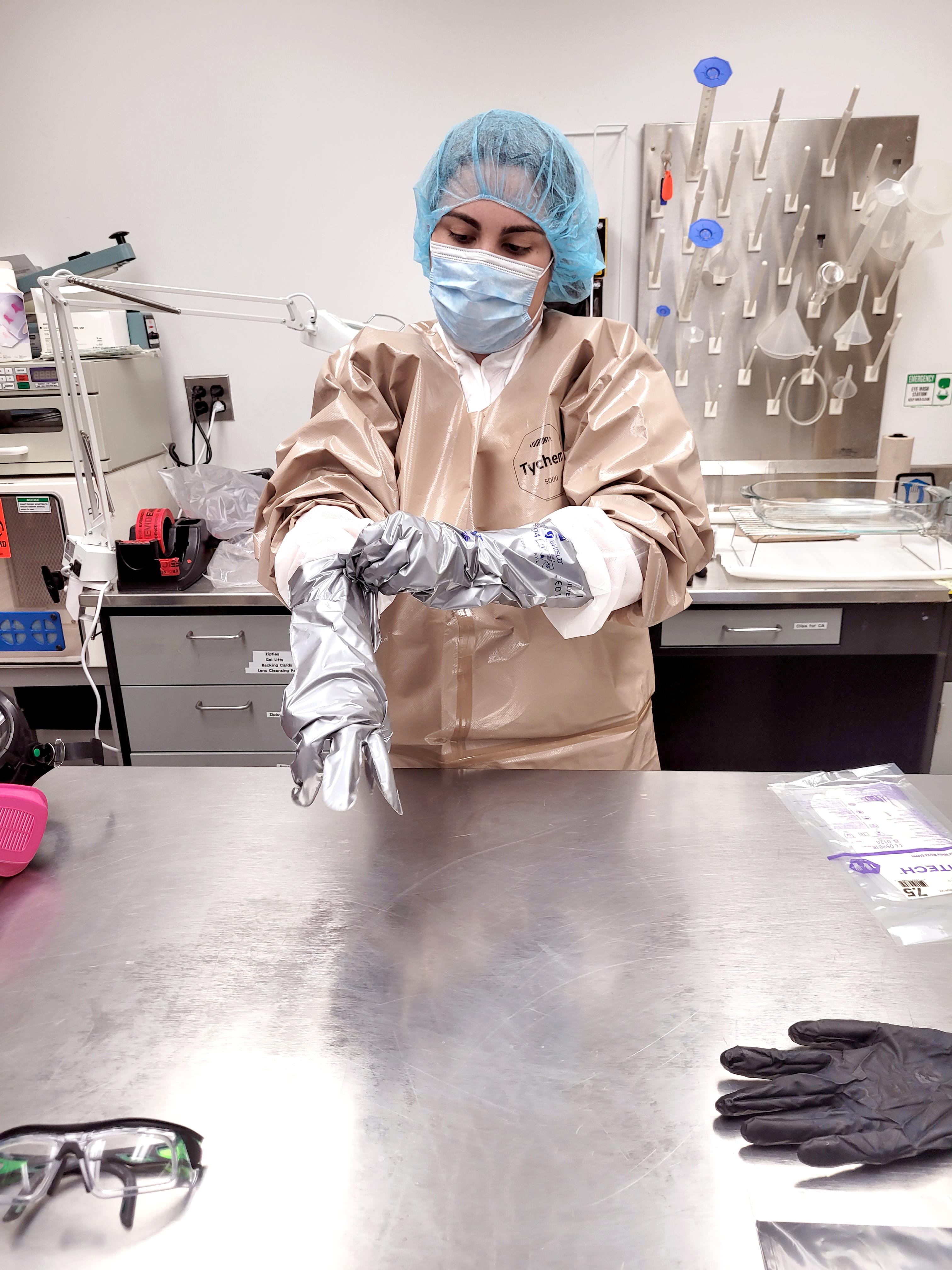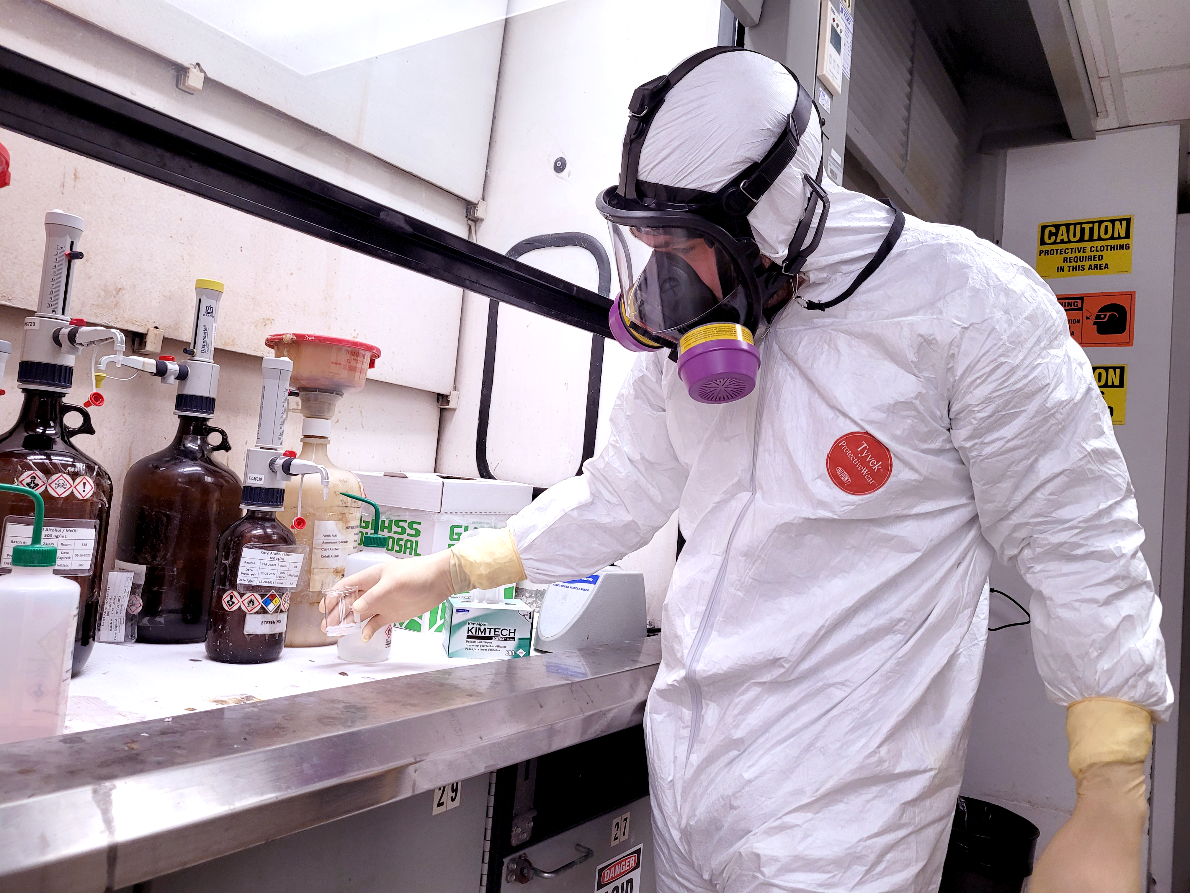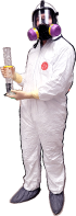 - A respirator and second pair of gloves worn over a waterproof hooded bodysuit with attached booties are necessary for bulk substances that must be broken up and weighed before testing.