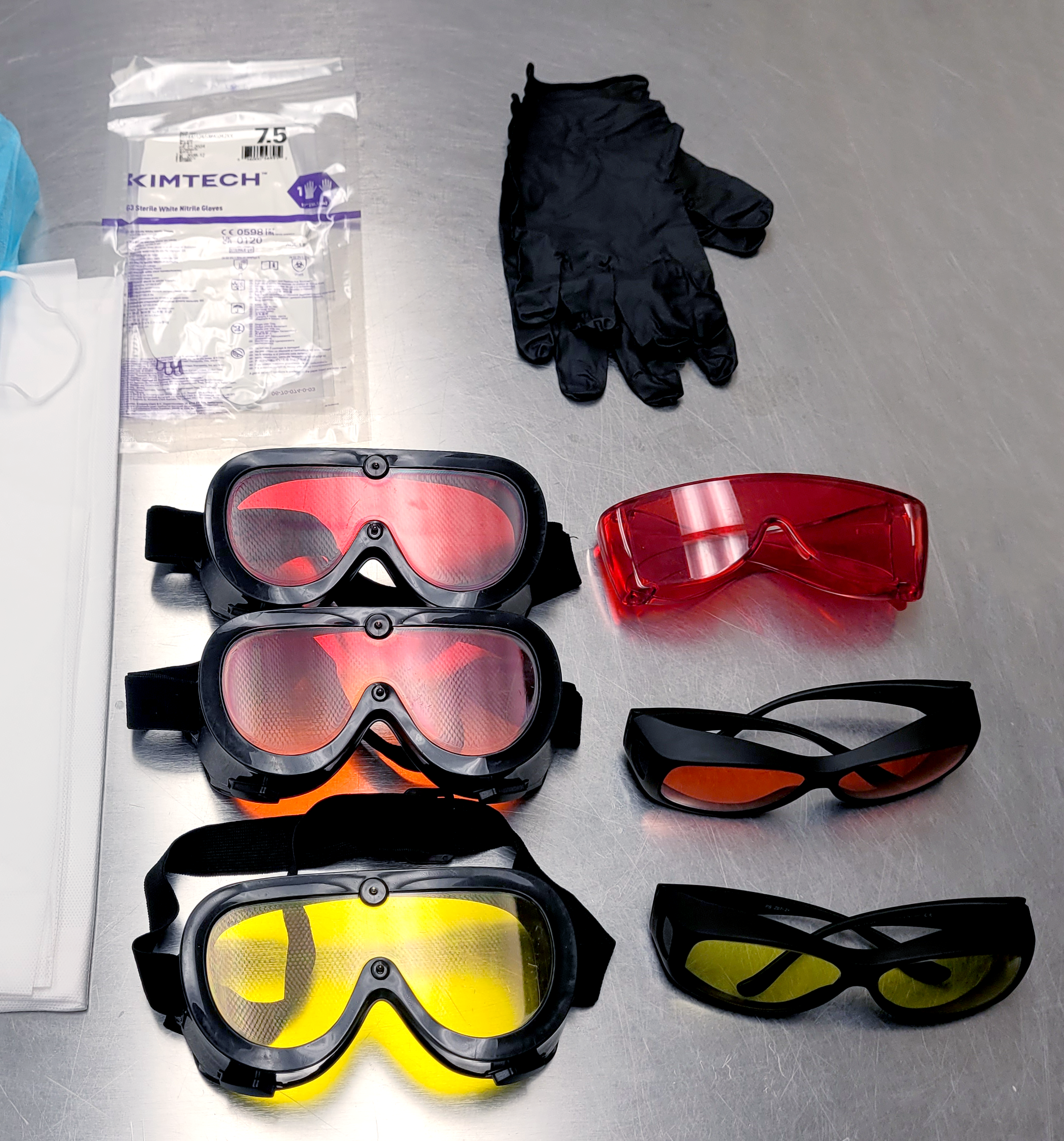 - Goggles, latex gloves, and N95 masks protect from fumes and errant particles.