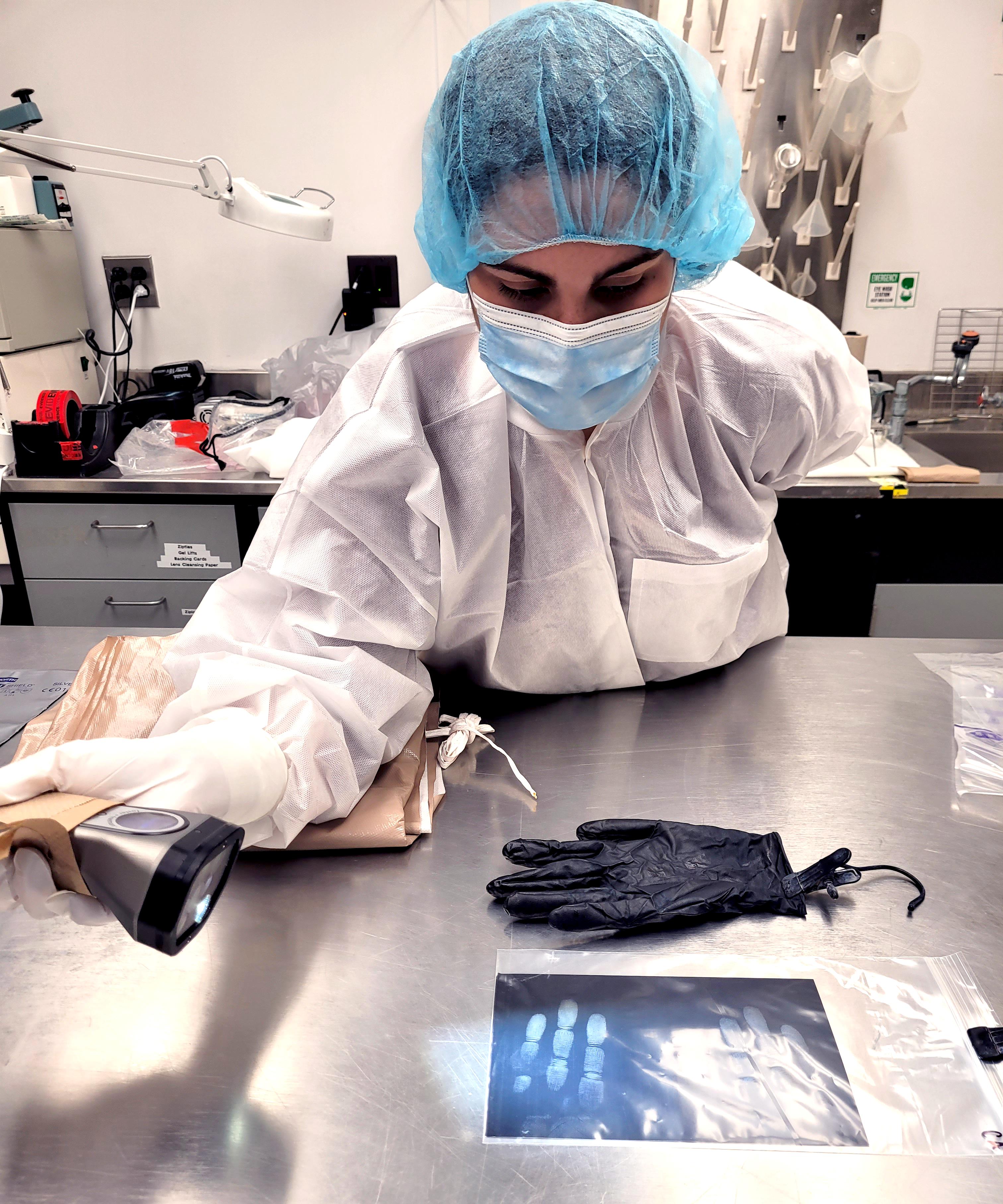 - Gloves, hairnets, masks, and fluid-resistant lab gowns are worn while examining evidence to maintain a sterile surface and prevent materials from coming into direct contact with skin or clothing.