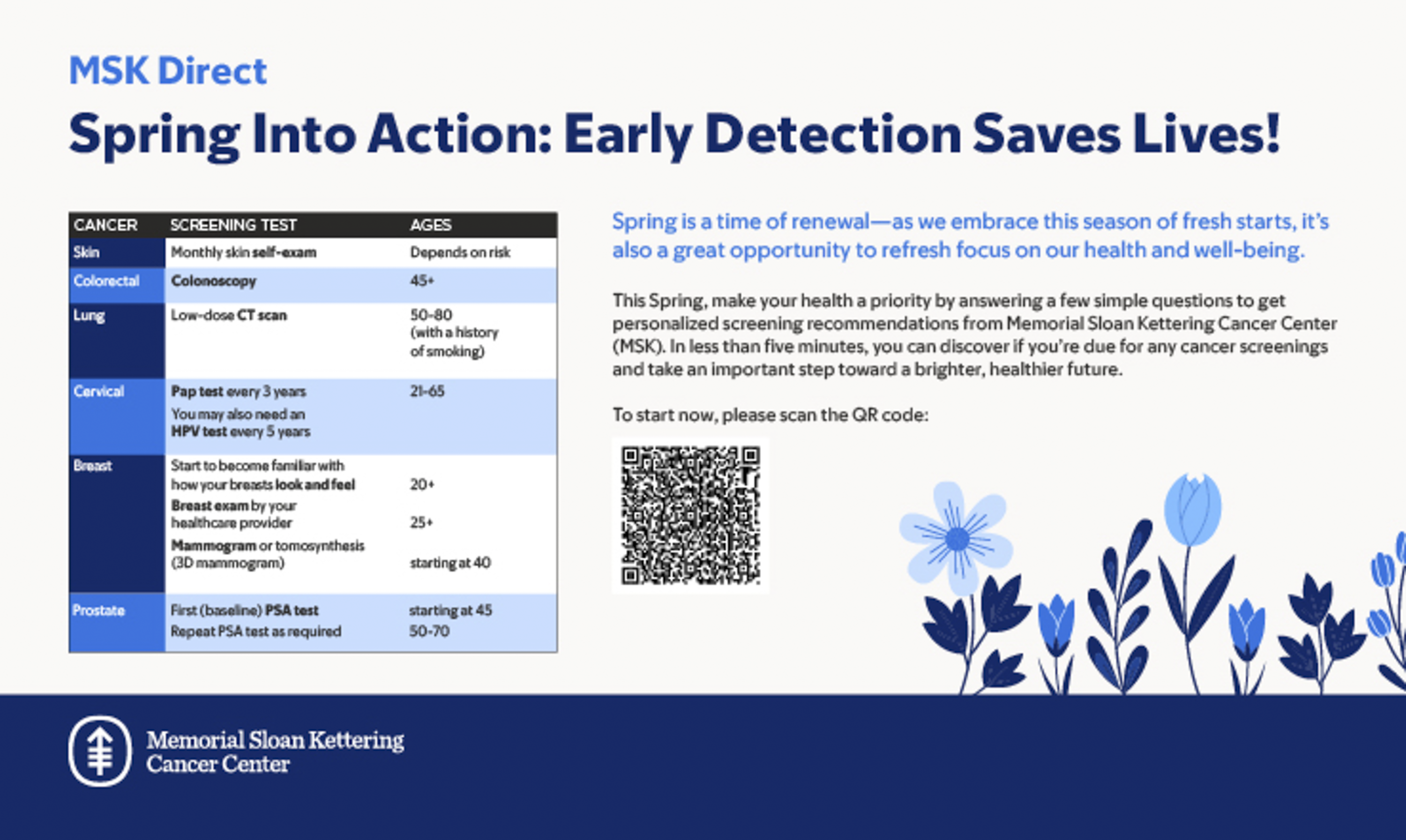 This Spring, make your health a priority by answering a few simple questions to get personalized screening recommendations from Memorial Sloan Kettering Cancer Center (MSK). In less than five minutes, you can discover if you’re due for any cancer screenings and take an important step toward a brighter, healthier future.
