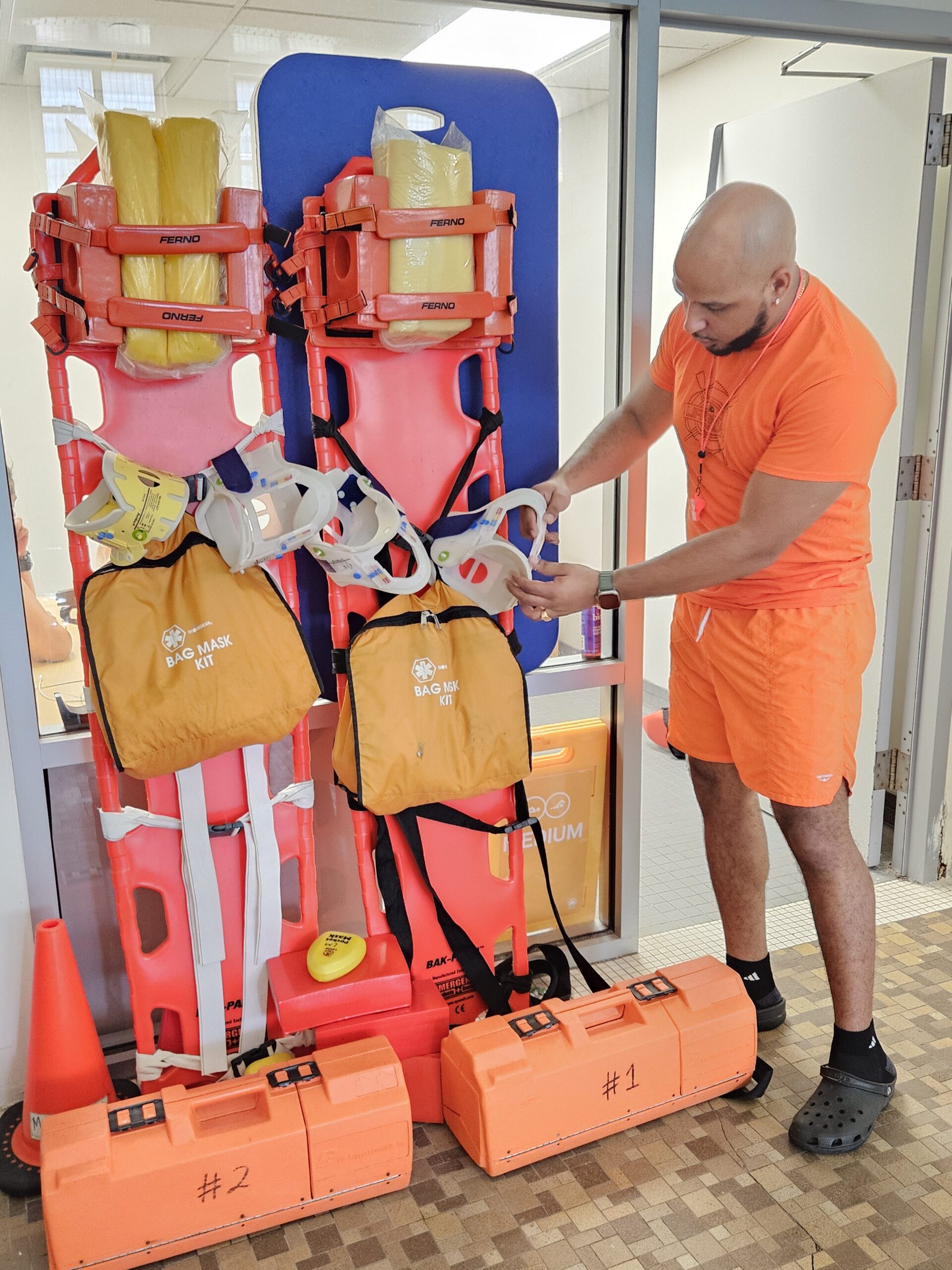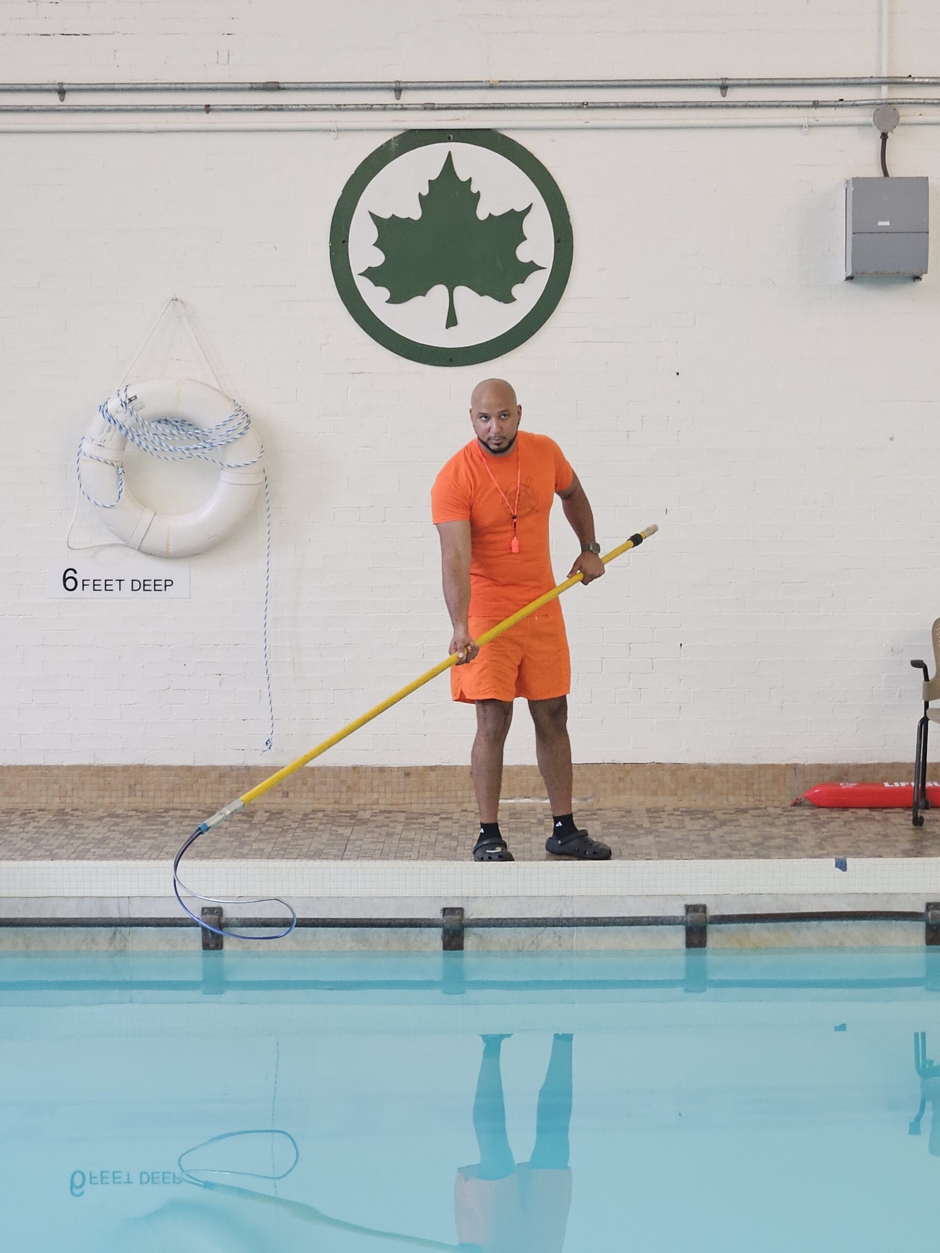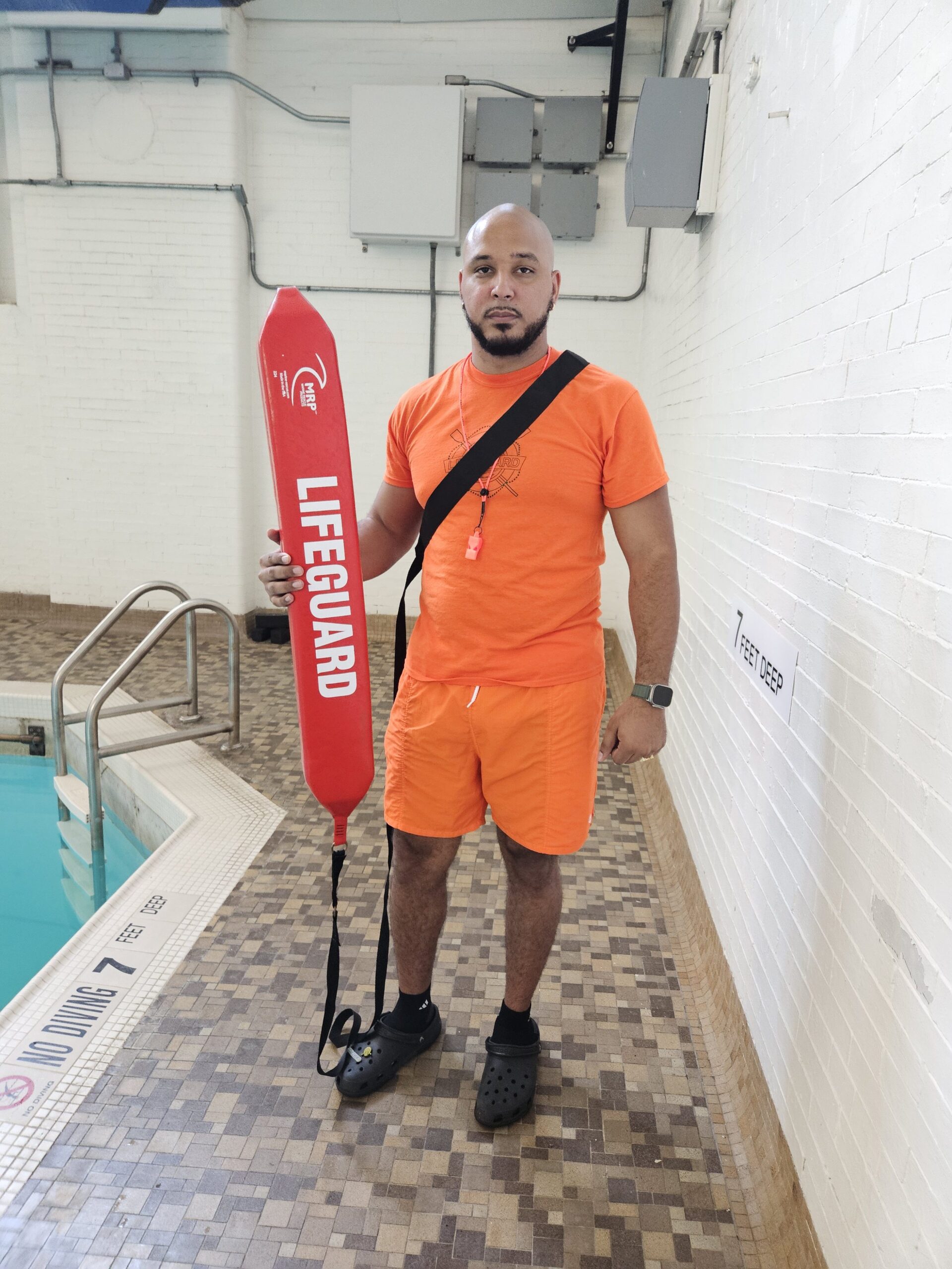 Luis Martinez has been a pool lifeguard for 15 years. When he arrives at Manhattan’s Gertrude Ederle Recreation Center, he dons his lifeguard uniform, checks the equipment, and hydrates before his watch begins over the indoor pool. As an NYC lifeguard, he has completed the lifeguard training program, passed a written test, and successfully completed the swimming test.