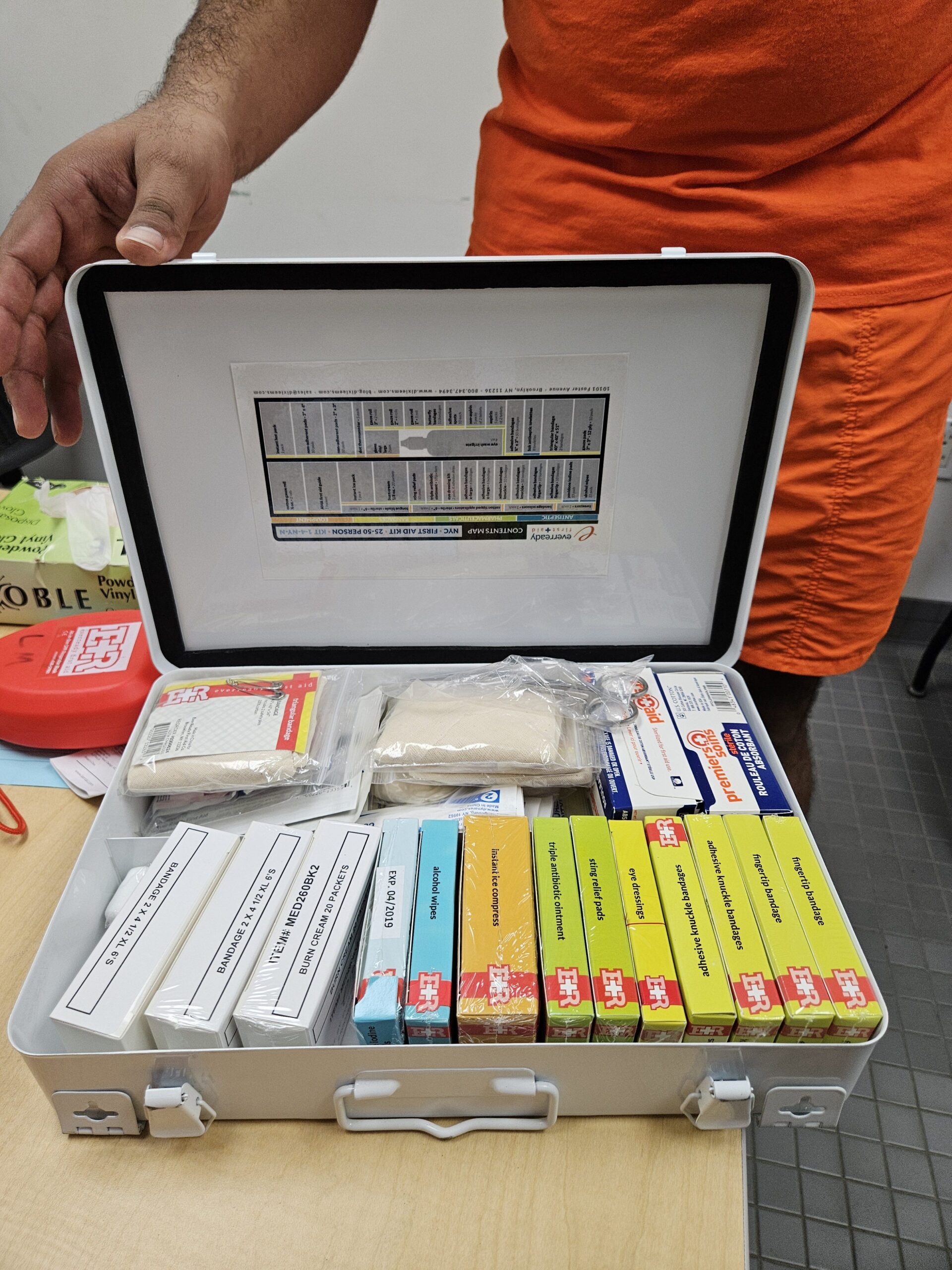 First Aid Kit (at right): contains essential supplies used to address common injuries and emergencies, including gauze, scissors, disposable gloves, Band-aids, over-the-counter medications, disinfectant, bandages, cold packs, and CPR masks. Lifeguards aim to stabilize the injured and immediately call 911 for further emergency services.