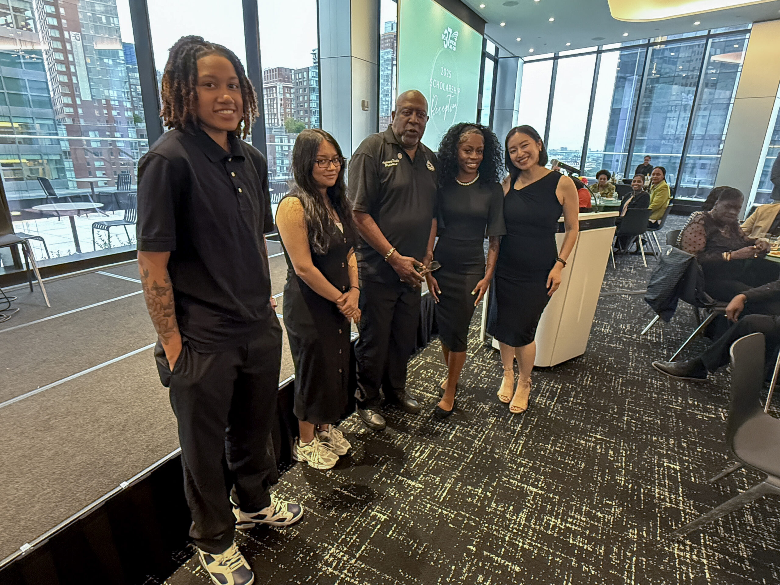 The DC 37 Education Committee held its annual event honoring this year’s scholarship winners on June 27 at union headquarters. The 2025 winners are, from left: Saniyah McNealy (child of Cristina McNealy of SSEU Local 371), winner of the Overcoming Obstacles Scholarship; Addrita Biswas (child of SSEU Local 371 member Tapati Mondal), winner of the Memorial Scholarship; SSEU Local 371 President Anthony Wells; Breonna Cornelius (child of Tisha Benbow, SSEU Local 371 member), winner of the Evelyn Gaskin Scholarship, and Local 3778 President Olivia Duong, Chair of the DC 37 Education Committee. Not pictured: Local 2054 member Michelle Velez, winner of the Dwayne Dugger Memorial Scholarship; Anna Orlovtsev (child of Local 3652 member Stanislav Orlovstev), winner of the Education Committee Scholarship; and Local 2627 member Argenis Luna, winner of the Lillian Roberts Scholarship. Photo by Mike Lee.