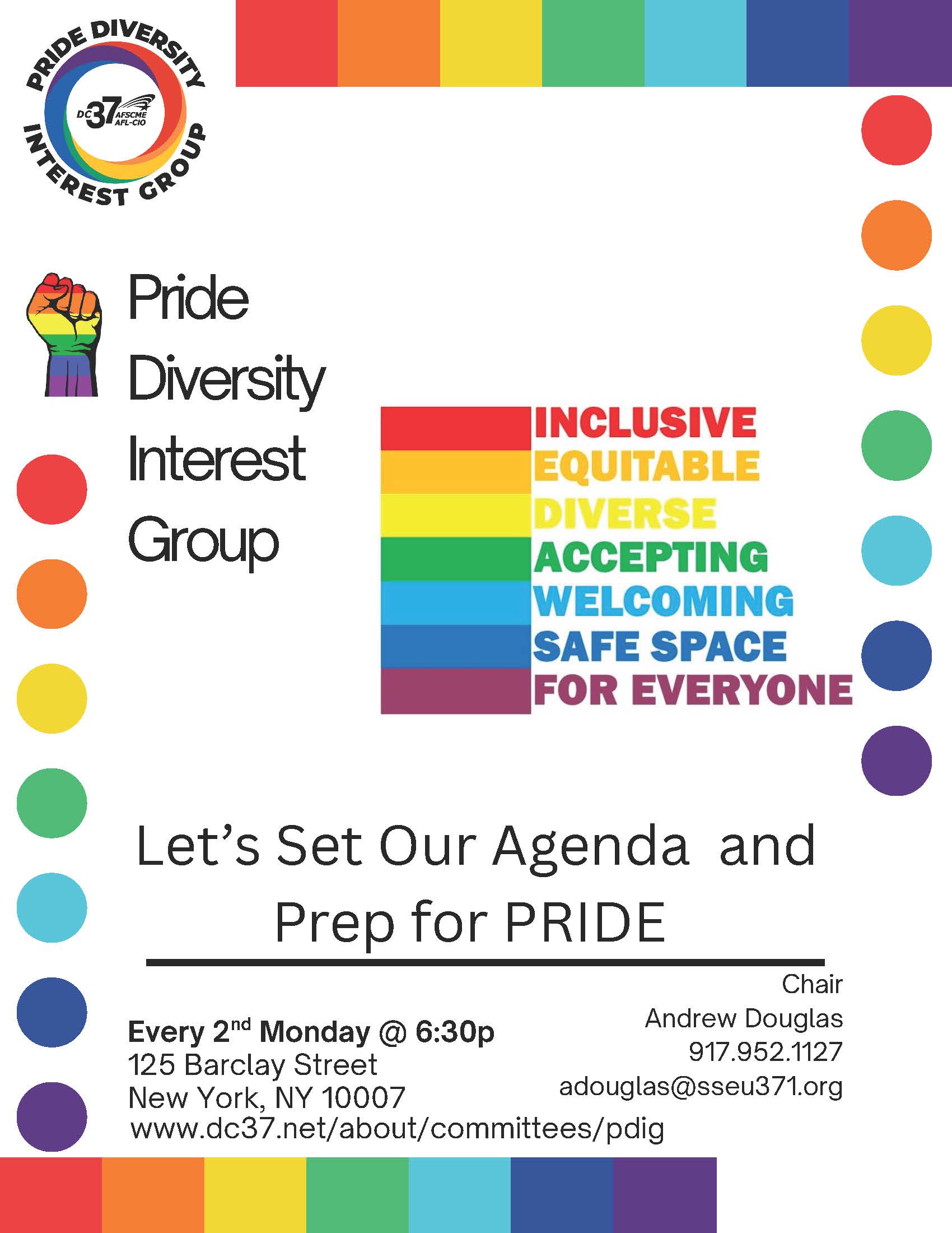 The DC 37 Pride Diversity Interest Group (PDIG) meets every second Monday at 6:30 p.m. at DC 37 Headquarters. For more information, contact Committee Chair Andrew Douglas at adouglas@sseu371.org.