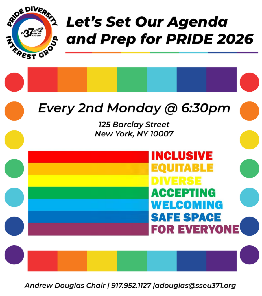 As we move forward toward Spring, it’s time for us to prepare for Pride 2026! The DC 37 Pride Diversity Interest Group (PDIG), meets on every 2nd Monday, at 6:30 p.m. Our meetings offer a welcoming safe space for all DC 37 members and retirees. We hope you join us as we get ready for June!