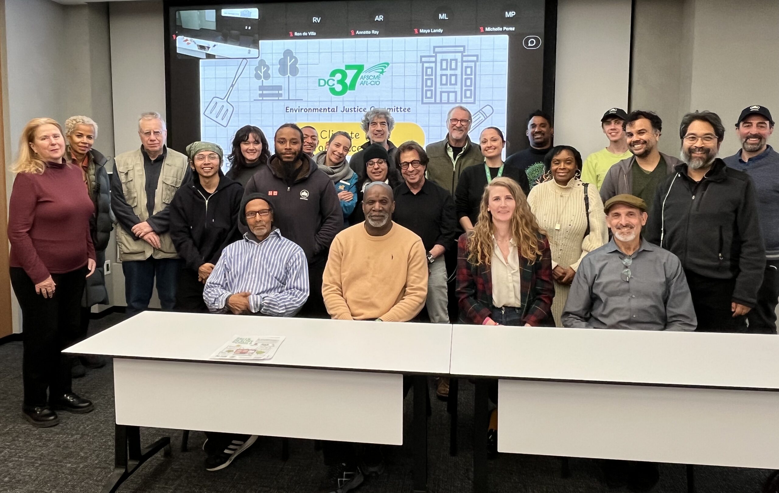 The DC 37 Climate Justice Committee hosted a hybrid discussion, Climate is a Workplace Issue, on Dec. 9 at 125 Barclay. Presenters on the two panels and pictured included: Climber and Pruner Jose Torres, vice president of Local 1506; School Lunch Assistant Cook Janice Sutherland of Local 372; Committee Chair Lorraine Barcant, vice president of Local 1740; Committee Co-chair Jon Forster, DC 37 Retiree; Landscape Architect Ricardo Hinkle of Local 375; NYCHA Architect Josh Barnett of Local 375; DOE Climate Educator Kailyn Fox of Local 375, who also served as moderator. Photo courtesy Jon Forster