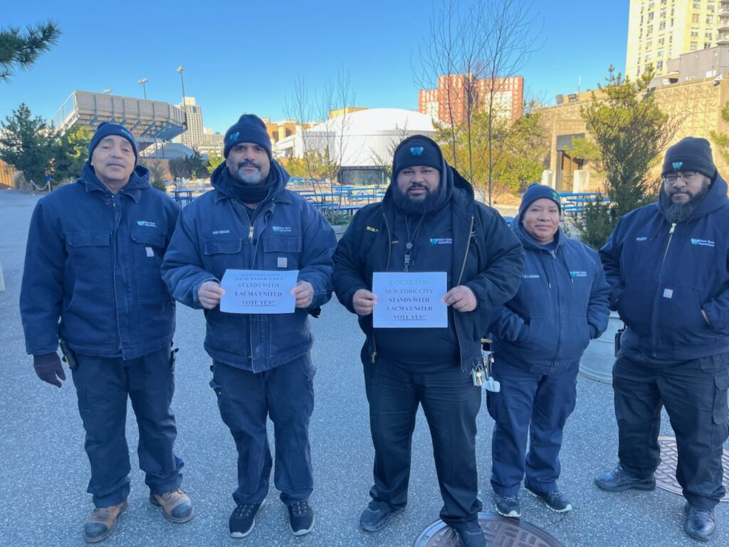 Workers at the Los Angeles County Museum of Art (LACMA) held a union election on Dec. 15. To show support for the workers of LACMA United, DC 37 members in the Culturals Sector sent messages of solidarity to their union siblings ahead of the election. Pictured are members of Local 1559 American Museum of Natural History, gardeners from Brooklyn Botanic Garden Local 374 Quasi Public Employees, and DC 37 Local 1501 Wildlife Conservation Society attendants and security guards at the New York Aquarium. LACMA workers voted 96% in favor of unionizing with AFSCME District Council 36 in California.