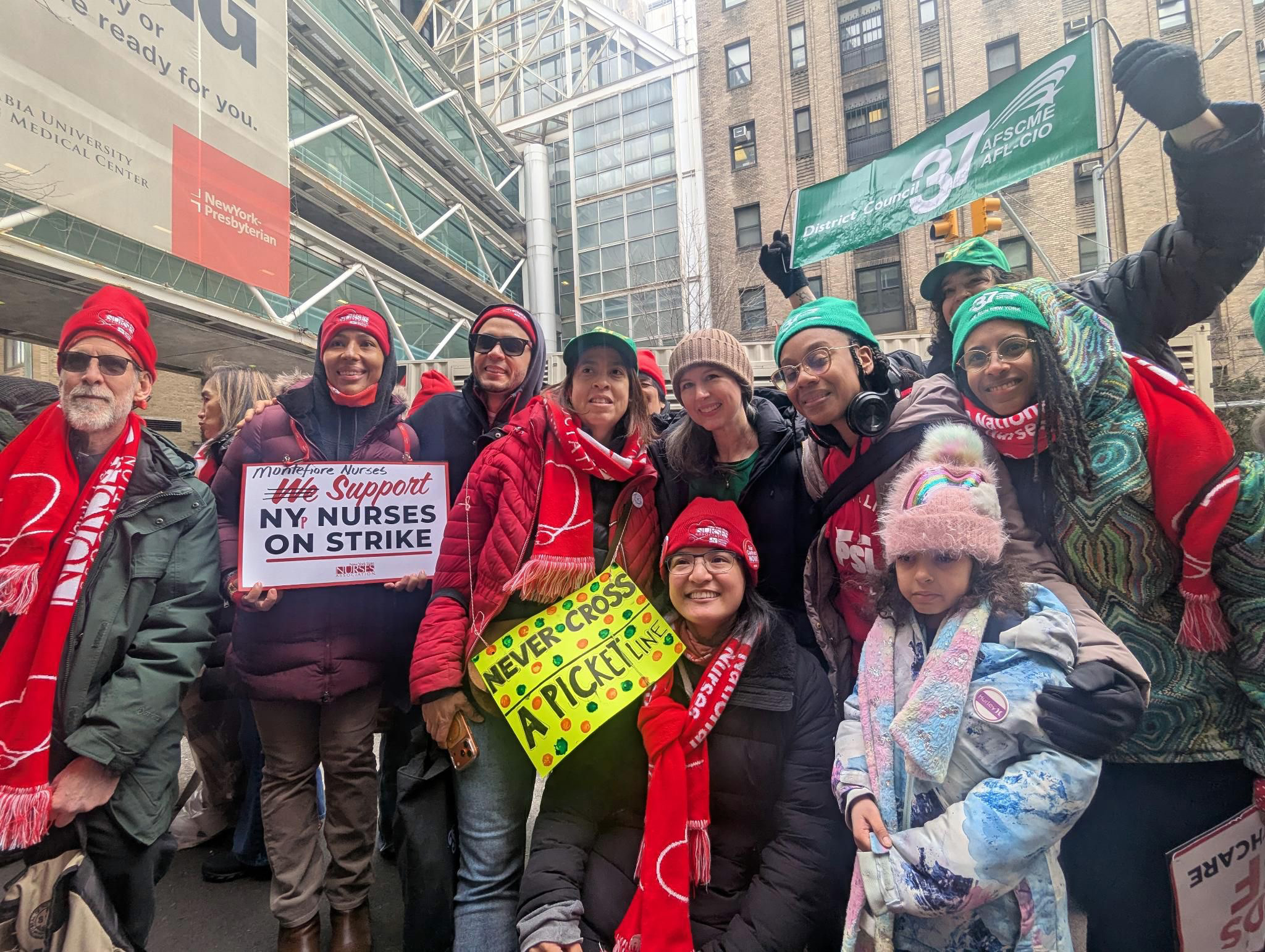 Union Strong: Members of DC 37 Locals 436, 768, 3005, and their families joined the NYSNA picket line on Feb. 16 to support nurses striking against New York-Presbyterian Hospital. Photo by Jill Humphrey